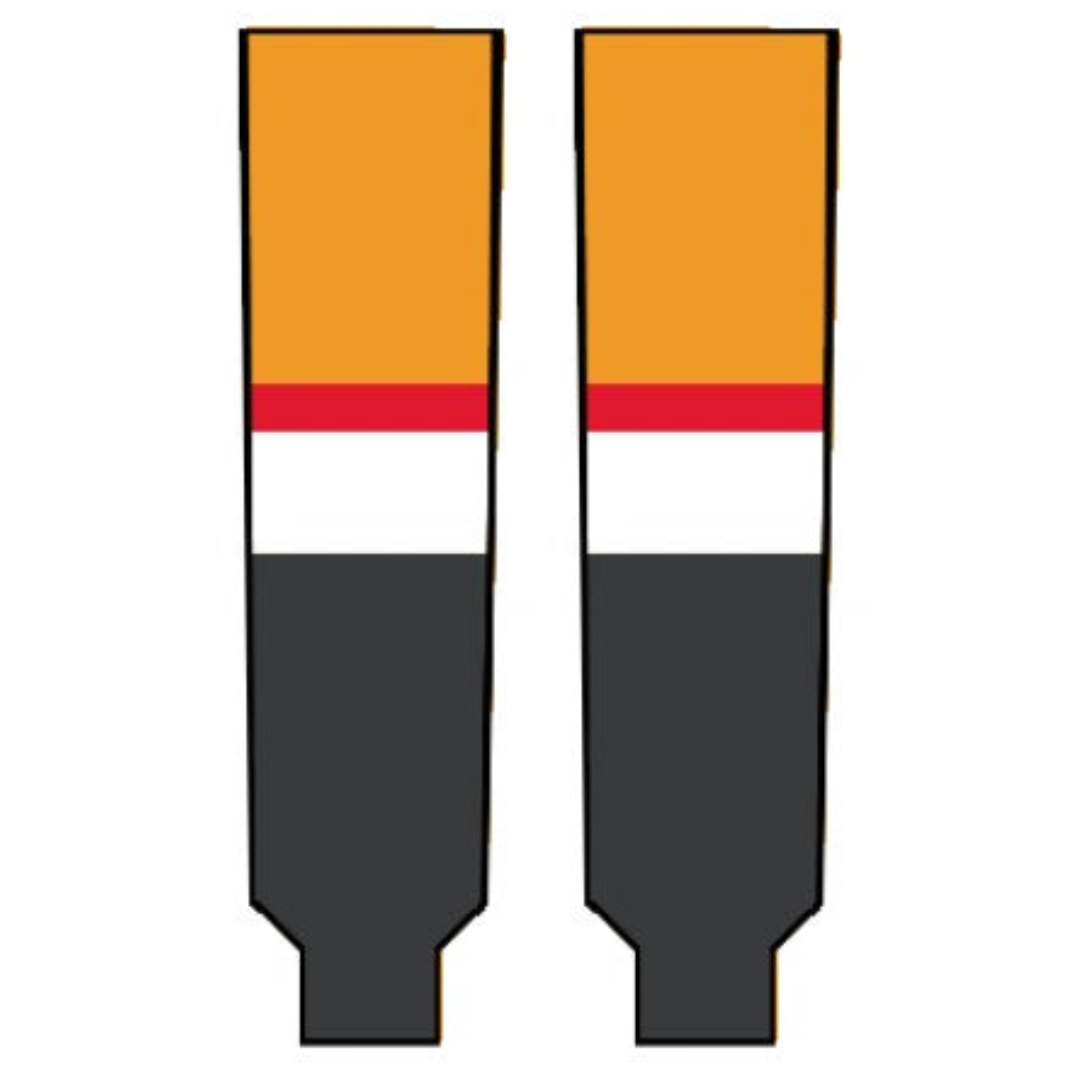 Modelline Las Vegas Golden Knights Third Gold Knit Ice Hockey Socks have a Vegas gold base with 1 red stripe, 1 thick white stripe and a charcoal grey bottom. These classic knit hockey socks are knitted with a durable acrylic yarn.