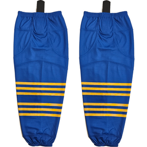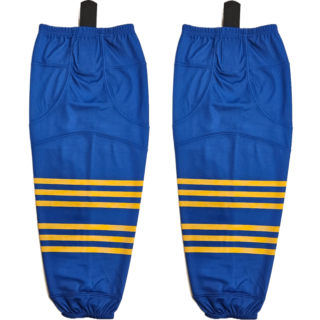 Modelline 1970s Buffalo Sabres Away Royal Blue Sublimated Mesh Ice Hockey Socks have a royal blue base with 6 thin gold stripes. These mesh socks have the striping pattern sublimated (not sewn) onto the socks and feature velcro tabs designed to work with jocks to hold socks up.