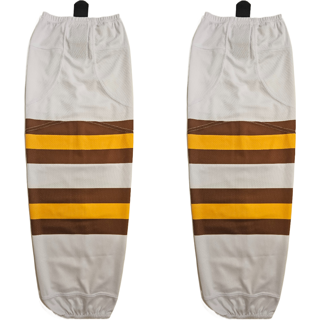 Modelline 1933 Boston Bruins White Sublimated Mesh Ice Hockey Socks have a white base with 4 brown stripes and 2 gold stripes. These mesh socks have the striping pattern sublimated (not sewn) onto the socks and feature velcro tabs designed to work with jocks to hold socks up.
