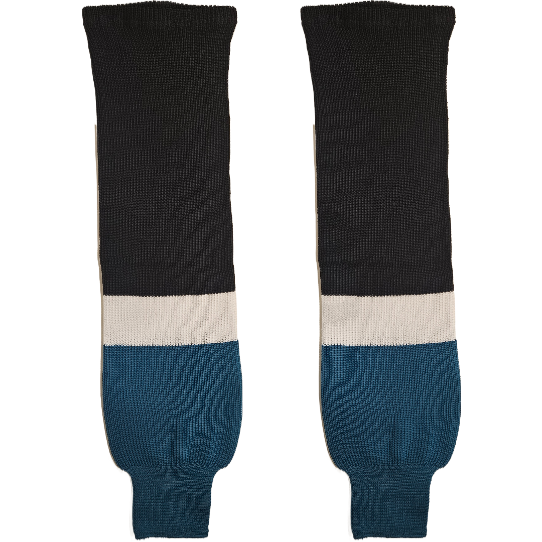Modelline 2015 San Jose Sharks Stadium Series Black/Pacific Teal Knit Ice Hockey Socks have a Black base with 1 thick white stripe and a Pacific Teal bottom. These classic knit hockey socks are knitted with a durable acrylic yarn.