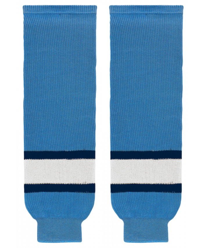 Modelline 1970s Pittsburgh Penguins Away Powder Blue Knit Ice Hockey Socks have a powder blue base with 2 thin navy stripes and 1 thick white stripe. These classic knit hockey socks are knitted with a durable acrylic yarn.