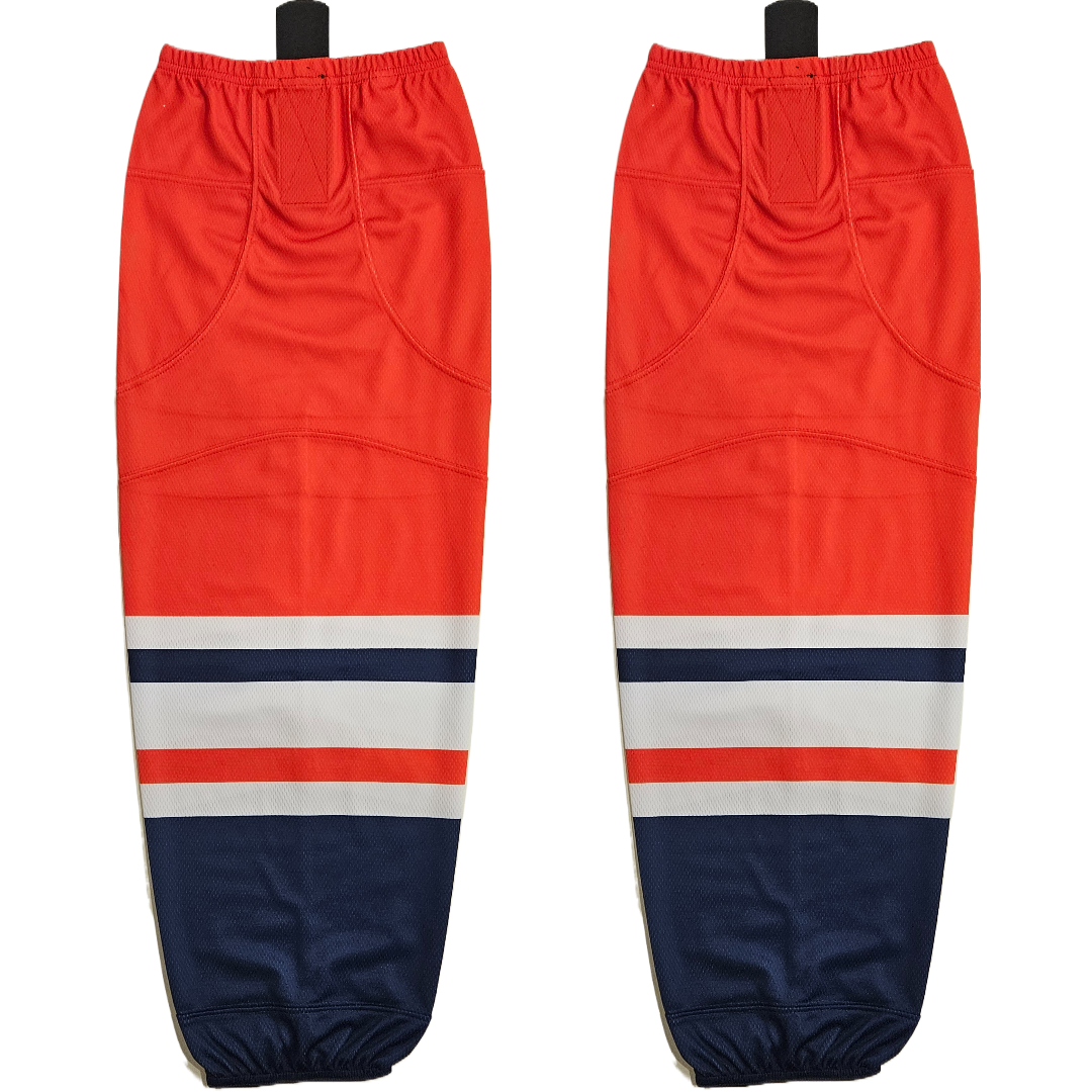 Modelline 1926 New York Americans Red Sublimated Mesh Ice Hockey Socks have a red base with 3 white stripes, 1 navy stripe, 1 red stripe and a navy bottom. These mesh socks have the striping pattern sublimated (not sewn) onto the socks and feature velcro tabs designed to work with jocks to hold socks up.