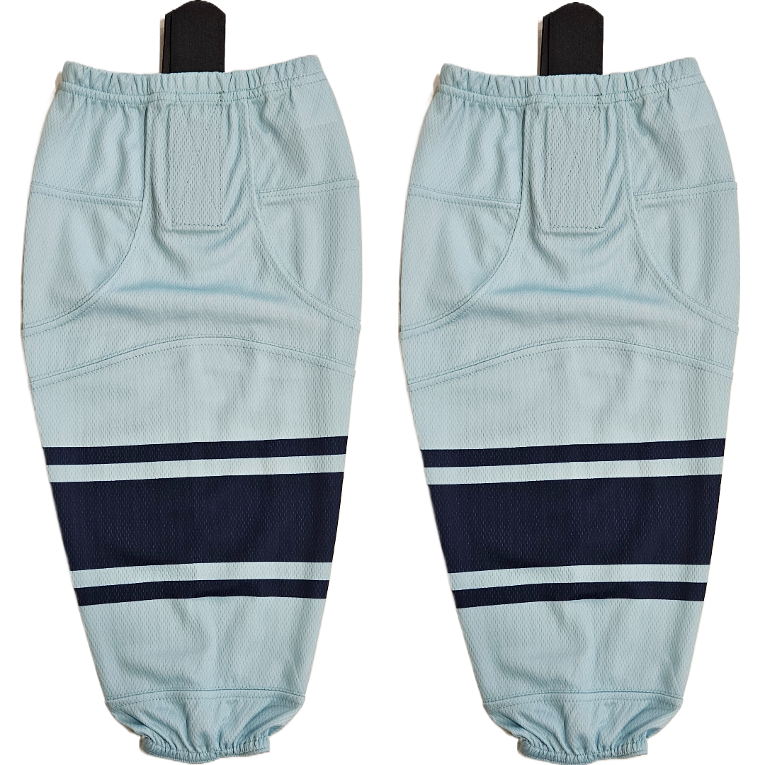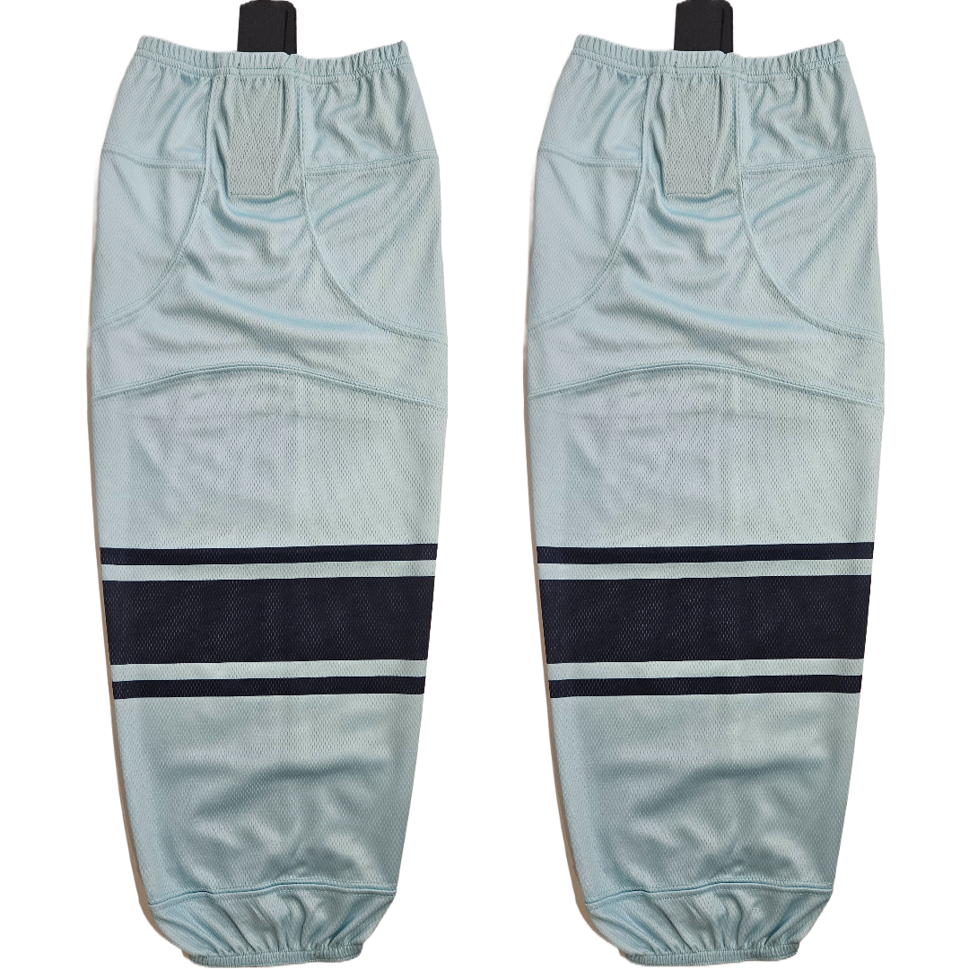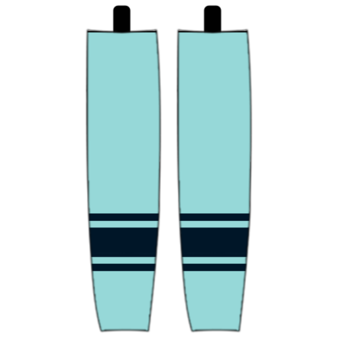 Modelline 2023 Seattle Kraken Reverse Retro Ice Blue Sublimated Mesh Ice Hockey Socks have an ice blue base with 1 thick navy stripe and 2 thin navy stripes. These mesh socks have the striping pattern sublimated (not sewn) onto the socks and feature velcro tabs designed to work with jocks to hold socks up.
