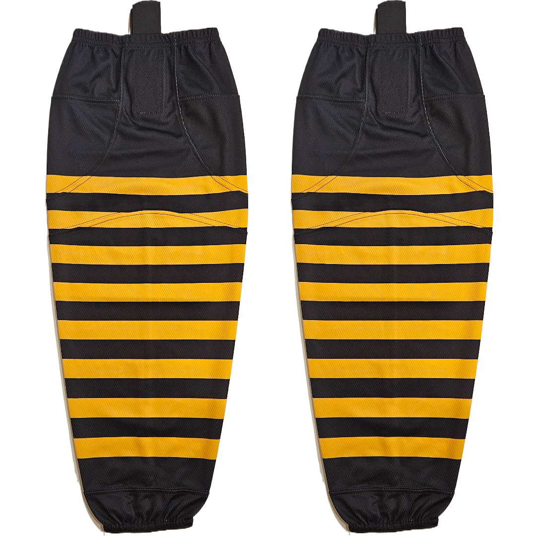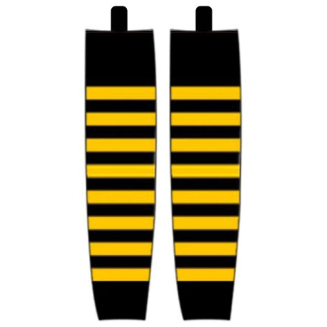 Modelline 1923-25 Hamilton Tigers Black Sublimated Mesh Ice Hockey Socks have a black base with gold stripes. These mesh socks have the striping pattern sublimated (not sewn) onto the socks and feature velcro tabs designed to work with jocks to hold socks up.