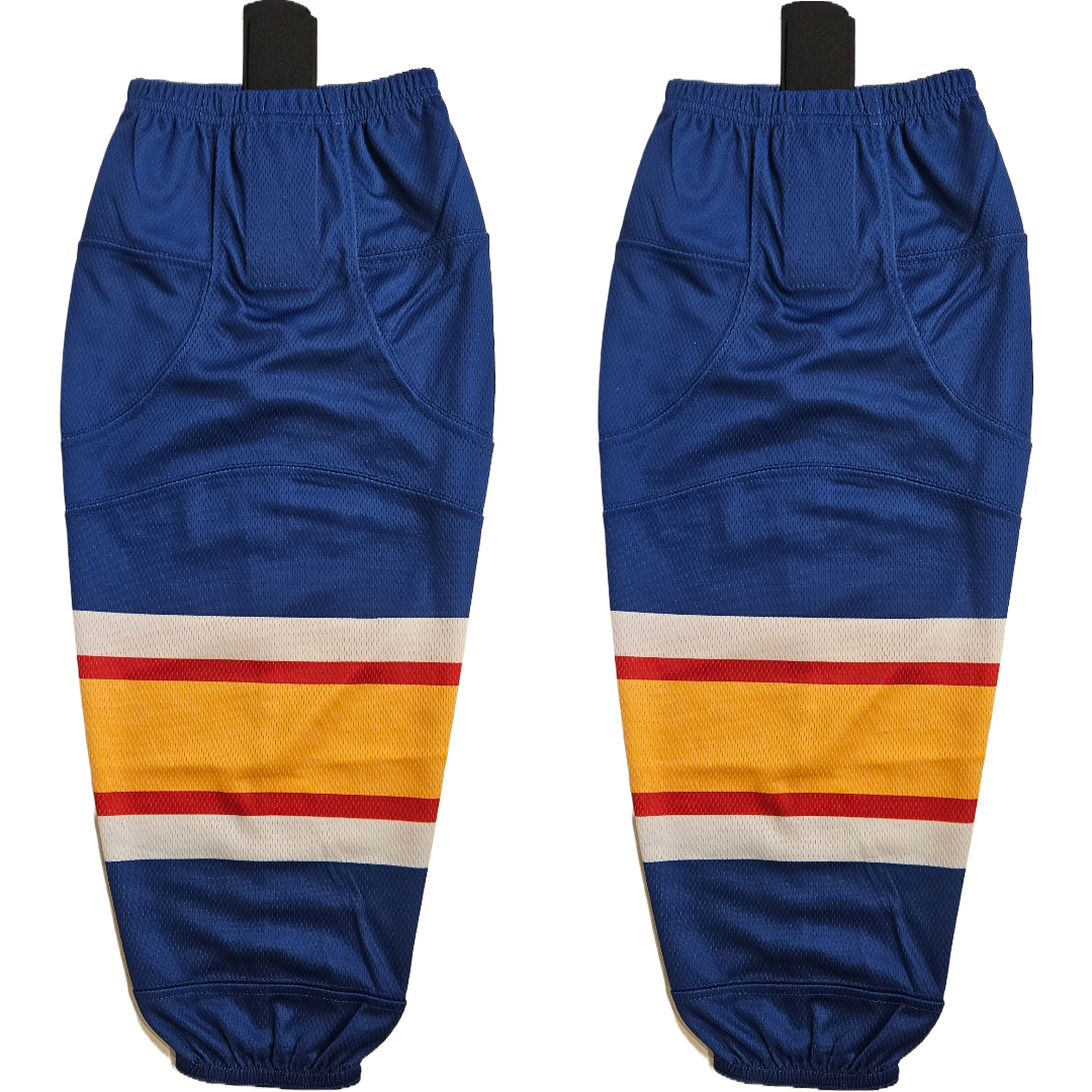 Modelline 1985-1994 St. Louis Blues Away Royal Blue Sublimated Mesh Ice Hockey Socks have a royal blue base with 1 thick gold stripe, 2 white stripes and 2 thin red stripes. These mesh socks have the striping pattern sublimated (not sewn) onto the socks and feature velcro tabs designed to work with jocks to hold socks up.
