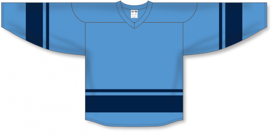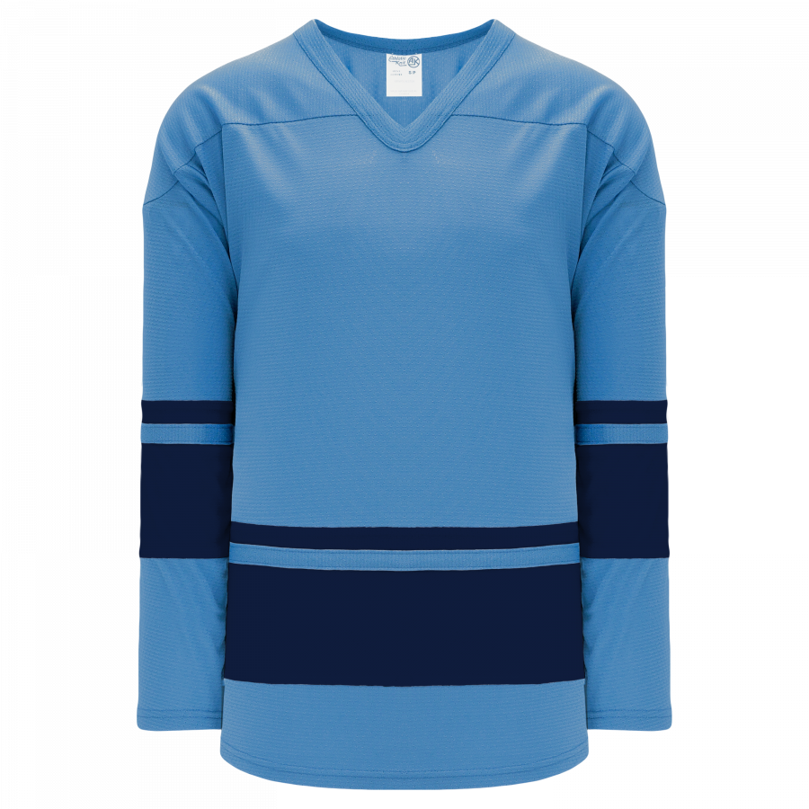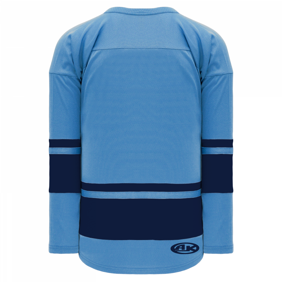 The Athletic Knit H6400A-232 Adult Sky Blue/Navy League Hockey Jerseys feature an AK-knit fabric made from individual pieces of fabric for greater durability.