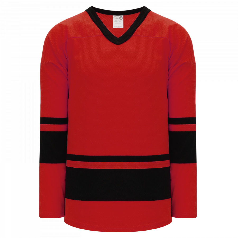 The Athletic Knit H6400A-264 Adult Red/Black League Hockey Jerseys feature an AK-knit fabric made from individual pieces of fabric for greater durability.