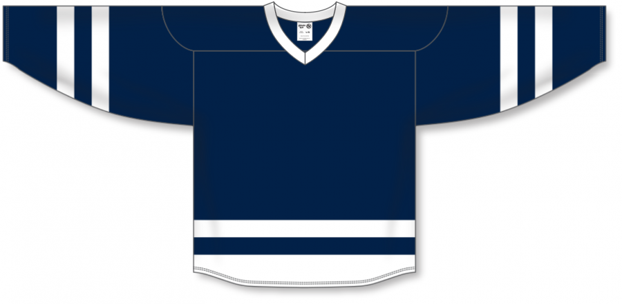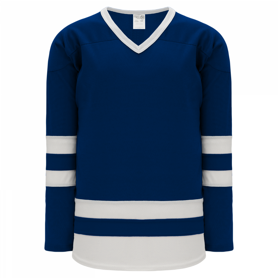 The Athletic Knit H6500A-216 Adult Navy/White League Hockey Jerseys  feature an AK-knit fabric made from individual pieces of fabric for greater durability.
