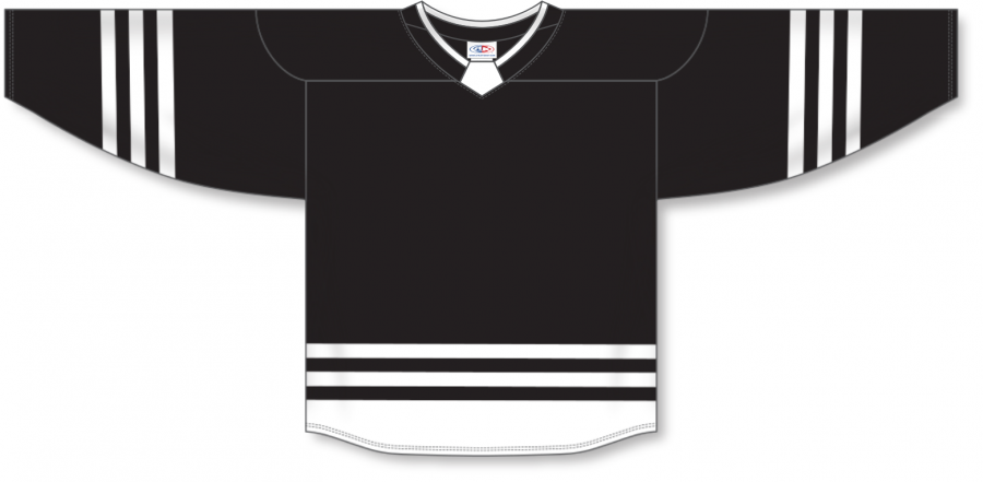 The Athletic Knit H8000A-221 Adult Black/White League Hockey Jerseys feature an AK-knit fabric made from individual pieces of fabric for greater durability.