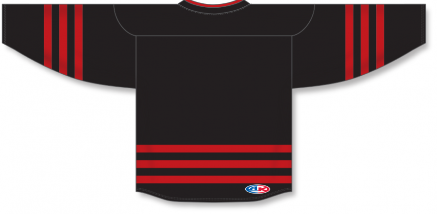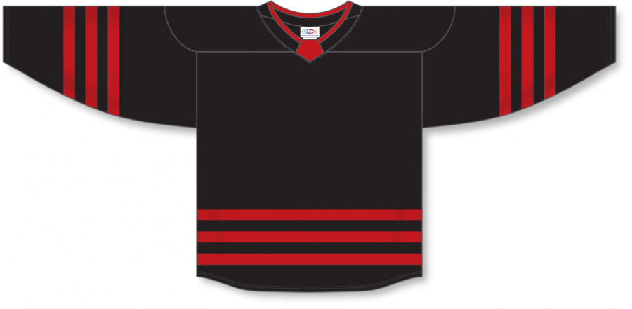 The Athletic Knit H8000A-249 Adult Black/Red League Hockey Jerseys  feature an AK-knit fabric made from individual pieces of fabric for greater durability.
