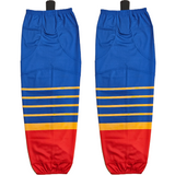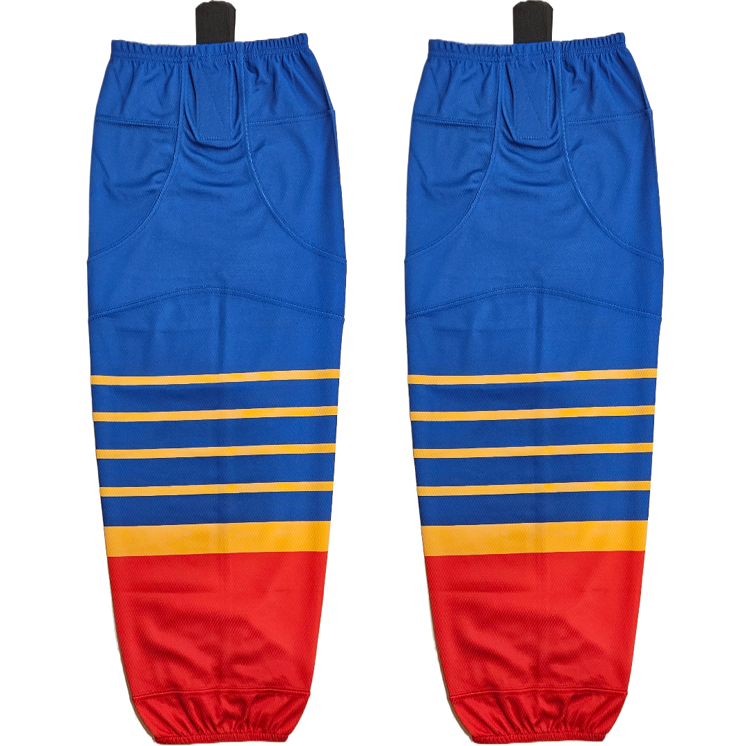 Modelline 1996-97 St. Louis Blues Away Royal Blue Sublimated Mesh Ice Hockey Socks have a royal blue base with 4 thin gold stripes, 1 gold stripe and a red bottom. These mesh socks have the striping pattern sublimated (not sewn) onto the socks and feature velcro tabs designed to work with jocks to hold socks up.